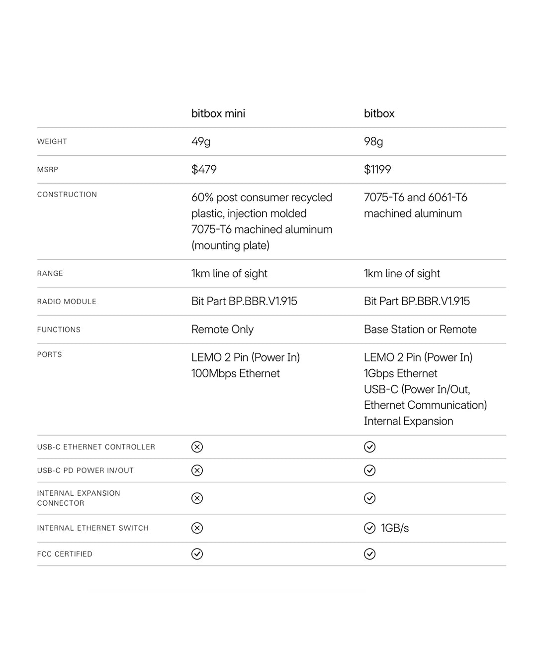 What’s different from the “big” bitbox? No USB-C, no expansion options, no internal Ethernet switch. Just the same range and reliability in an incredibly small form factor. It requires bitbox as the base station, since it only operates in remote mode. It’s backed by the same warranty and customer support.